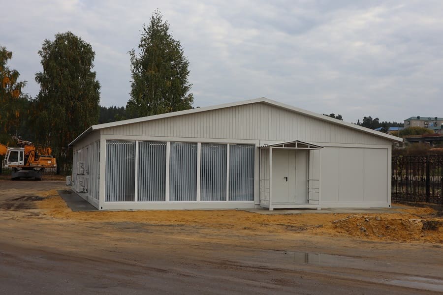 Модульный офис произведен и смонтирован для Заказчика в Пензенской области. Это одноэтажное модульное здание со вторичной кровлей. Помещение шоу-рума выполнено с витражным остеклением. Для обогрева панорамных окон использованы плинтусные обогреватели.