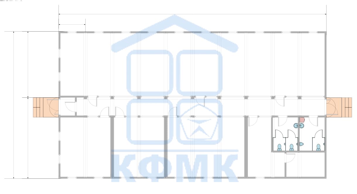 Модульное здание на базе 10 модулей 6055х2435х2770мм(в), 10 модулей 7325х2435х2770мм(в), с комплектом общей кровли и набором внутренних и внешних стеновых панелей.